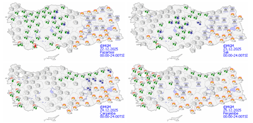 Meteoroloji Genel müdürlüğü (MGM) internet sitesinden alınan bilgilere göre 22-27 Aralık döneminde yurdun büyük bölümünde parçalı yer yer çok bulutlu hava görülecek.