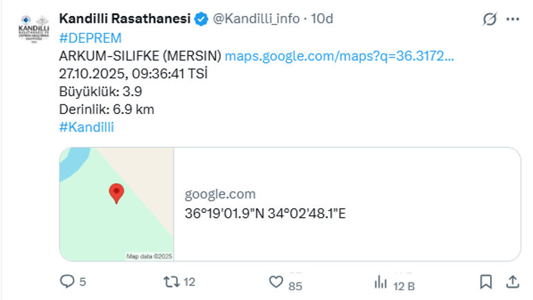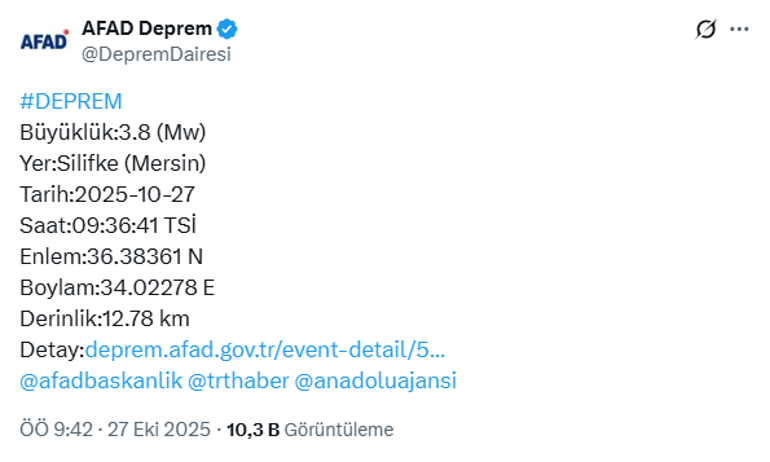 27 Ekim 2025 tarihinde meydana gelen deprem, AFAD’ın verilerine göre saat 09.36’da kaydedildi. Depremin derinliği ise 12.78 kilometre olarak ölçüldü.